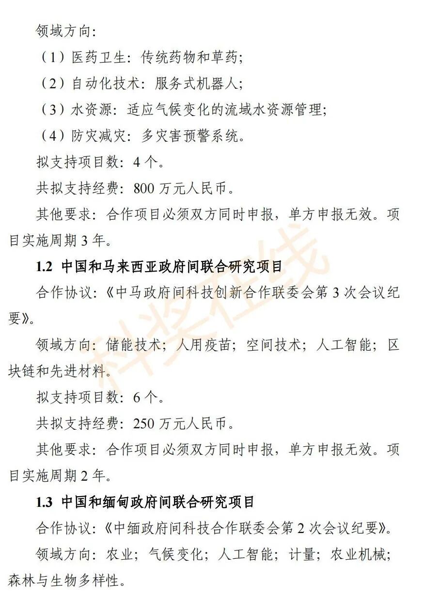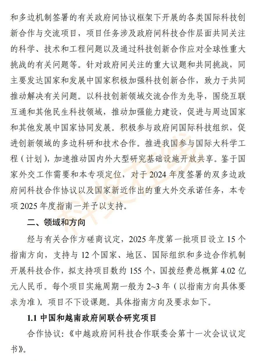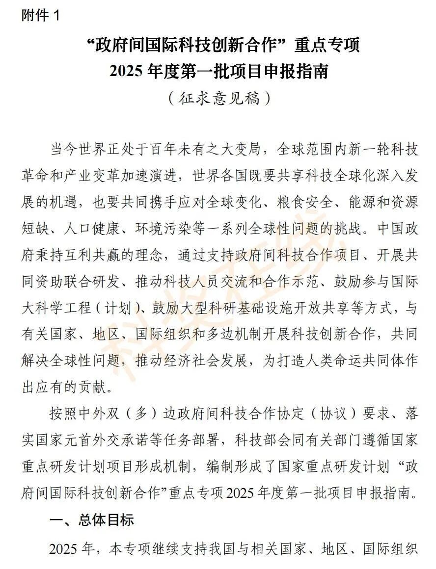 1.“政府间国际科技创新合作”重点专项2025年度第一批项目申报指南(征求意见稿)