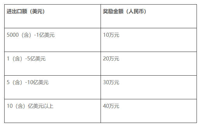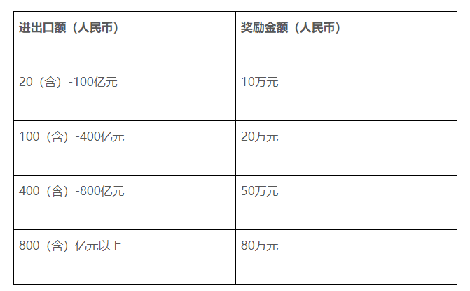 辖区上年度进出口额达到20亿人民币以上的企业,以及上年度跨境电商进出口额达到5000万美元以上的存量及新迁(新设)的跨境电商企业,根据上年度贡献情况,给予企业高管最高80万元奖励,同一企业一年只能申报1人。