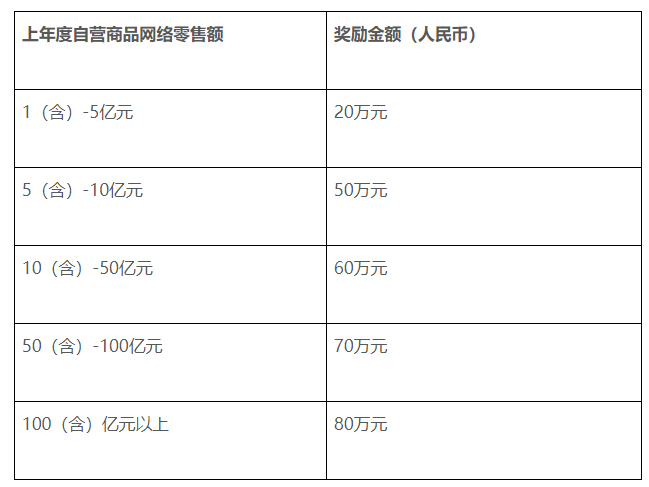 对在辖区注册,纳入福田区商业统计的电子商务平台企业,上年度网络商品零售额实现同比正增长,且自营商品网络零售额在1亿元以上的,给予其企业主要负责人/高级管理人员/技术团队负责人最高80万元的经营管理人才奖励。同一企业一年限申报1人。