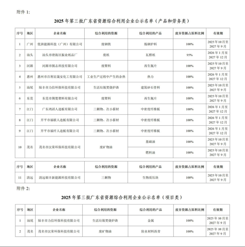 1、2025年第三批广东省资源综合利用企业公示名单(产品和劳务类)