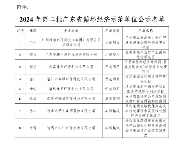 附件:2024年第二批广东省循环经济示范单位名单。